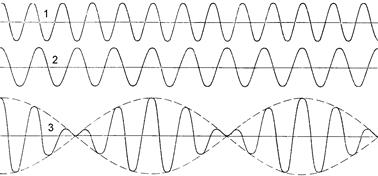 | (1) - колебания x1 = а cos 10wt, (2) колебание x2 = а cos 8wt, (3) результирующее колебание |