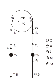 Рассматриваемая в задаче система состоит из двух движущихся поступательно грузов и одного вращающегося диска. На каждый из грузов действует две силы: сила тяжести mg, направленная вниз, и сила Т натяжения нити, направленная вверх. Запишем законы поступательного и вращательного движения этих тел.