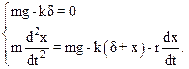 Направим ось x вдоль пружины по вертикали вниз, взяв начало отсчёта в положении статического равновесия груза m. Предположим, что груз движется в сторону возрастания х. Сила трения FТР направлена противоположно скорости движения груза, т. е. вертикально вверх. Проецируя уравнения системы (7.20) на ось х, получим: