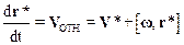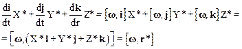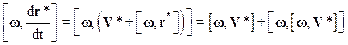 Первое слагаемое в полученном соотношении представляет собой относительную скорость частицы в подвижной СО – V*. Второе слагаемое преобразуем с учетом того (см. ), что производные векторов постоянной длины (например, ортов i, j, k) вращающихся вместе с системой координат с угловой скоростью w равны