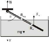 На стержень действуют сила тяжести стержня mg, приложенная в центре стержня, сила Архимеда FA, приложенная в центре погруженной в воду части стержня, и сила N реакции шарнира, приложенная в точке А шарнира.