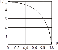 | Рис. 10.5. Лоренцево сокращение длины как функция релятивистского множителя b=V/c |