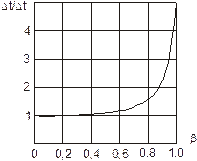 | Рис. 10.6. Лоренцево замедление времени как функция релятивистского множителя b=V/c |