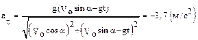 Разлагая ускорение снаряда g в точке В на направления касательной и нормали к траектории, отметим его нормальную аН и тангенциальную аτ составляющие. Из чертежа видно, что