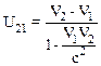 Ускоритель сообщил радиоактивному ядру скорость V1=0,4/с. В момент вылета из ускорителя ядро выбросило в направлении своего движения β-частицу со скоростью V2=0,75 с относительно ускорителя. Найти скорость U21 частицы относительно ядра.