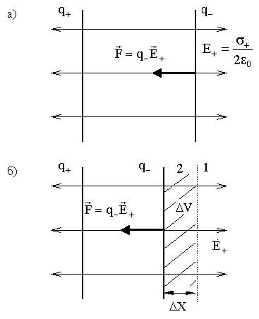 | (9.4.4.1) | Рассмотрим движение пластины с зарядом q- в поле пластины с зарядом q+. |