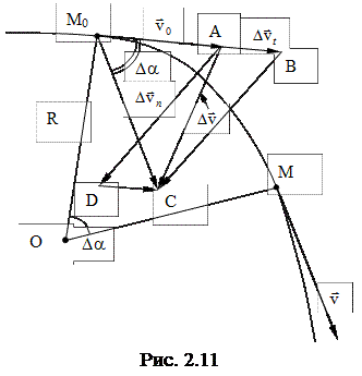 Рассмотрим движение материальной точки по криволинейной траектории (рис. 2.11). Вектор скорости движения в любой точке траектории направлен по касательной к ней. Пусть в точке M0 скорость