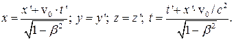 где a искомый коэффициент. Согласно первому постулату в силу равноправия систем отсчета для перехода от неподвижной системы отсчета к подвижной зависимость между координатами должна иметь аналогичный вид и отличаться лишь знаком для скорости vo: