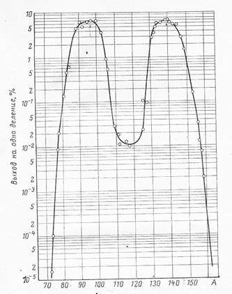 Рис. 4.2. Зависимость от массового числа выхода продуктов деления 235U тепловыми нейтронами.