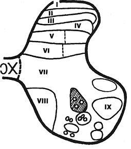 По универсальной классификаций серое вещество спинного мозга принято делить на 9 пластин (рис.3), различающихся по структуре и функциональной значимости составляющих их элементов: