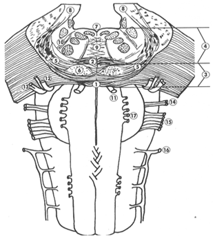 1 – срединная борозда; 2 – трапециевидное тело; 3 – основание моста; 4 – покрышка моста; 5 – поперечные волокна моста; 6 – продольные волокна моста; 7 –ромбовидная ямка; 8 – верхние ножки мозжечка; 9 – ретикулярная формация; 10 – медиальная петля; 11 – отводящий нерв; 12 – лицевой нерв; 13 – кохлеовестибулярный нерв; 14 – языкоглоточный нерв; 15 – блуждающий нерв; 16 – добавочный нерв; 17 – подъязычный нерв.