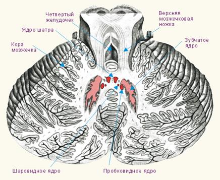 Ядра мозжечка. В глубине мозжечка по обе стороны от срединной линии находится ядро покрышки. Латеральнее этого ядра находятся небольшие шаровидные ядра. Еще более латерально лежит пробковидное ядро. В белом веществе полушарий находится самое крупное ядро мозжечка - зубчатое.