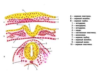 Нервная трубка представляет собой эмбриональный зачаток всей нервной системы человека. Из нее в дальнейшем формируется головной и спинной мозг, а также периферические отделы нервной системы. При смыкании нервного желобка по бокам в области его приподнятых краев (нервных валиков) с каждой стороны выделяется группа клеток, которая по мере обособления нервной трубки от кожной эктодермы образует между нервными валиками и эктодермой сплошной слой — ганглиозную пластинку. Последняя служит исходным материалом для клеток чувствительных нервных узлов (спинно- и черепномозговых ганглиев) и узлов вегетативной нервной системы, иннервирующей внутренние органы.