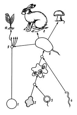 Рис. 1.2. Схема происхождения эукариотических клеток путем эндосимбиоза (по Л.Маргелис, с изменениями): 1 – разные группы оксифотобактерий, обладающие различными пигментами (предшественники хлоропластов), 2 – термоплазмы (термостойкие прокариоты), 3 – подвижные нефотосинтезирующие прокариоты (предшественники митохондрий), 4 – подвижные спирохеты или спироплазмы (предшественники жгутиков), 5 – гетеротрофная амебоидная эукариотическая клетка, 6 – древнейшая эукариотическая подвижная клетка, обладающая жгутиком, 7 – царство грибов, 8 – царство животных, 9 – зона нескольких предполагаемых симбиозов подвижной эукариотической клетки с различными группами оксифотобактерий; возникли различные линии эволюции растений, одна из них дала начало высшим растениям (10).