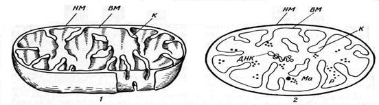 Рис. 2.4. Схемы строения митохондрии в трехмерном изображении (1) и на срезе (2): ВМ – внутренняя мембрана митохондрии; ДНК – нить митохондриальной ДНК; К – криста; Ма – матрикс; НМ – наружная мембрана митохондрии; Р – митохондриальные рибосомы.