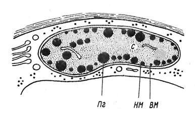 Рис. 2.6. Хромопласт клетки мезофилла лепестка лютика: ВМ – внутренняя мембрана; НМ – наружная мембрана; Пг – пластоглобула; С – строма.