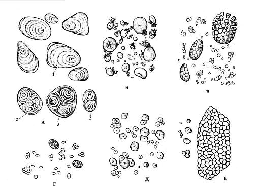 Рис. 2.10. Крахмальные зерна различных видов растений : А – картофель; Б – пшеница; В – овес; Г – рис; Д – кукуруза; Е – гречиха; 1 – простое зерно; 2 – сложное зерно; 3 – полусложное зерно.