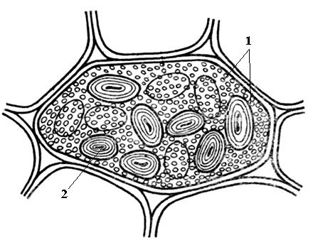 Рис. 2.12. Простые алейроновые и крахмальные зерна в клетке семядоли семени фасоли : 1 – простые алейроновые зерна; 2 – крахмальное зерно.