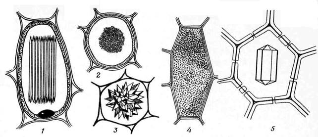 Образование включений вызвано избыточным накоплением некоторых продуктов обмена веществ в определенных участках клетки – в вакуоли, гиалоплазме, различных органеллах, реже в клеточной стенке. Эти вещества часто выпадают в осадок в аморфном виде или в форме кристаллов – включений. Включения имеют определенную форму и хорошо видны в световой микроскоп. По наличию тех или иных включений, их форме и распределению можно отличить одни виды, роды и семейства растений от других, поэтому они часто служат важным диагностическим признаком при анализе лекарственного растительного сырья.
