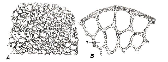 Рис. 3.3. Запасающая паренхима клубня картофеля ( A) и аэренхима стебля рдеста (Б): 1 – межклетник.
