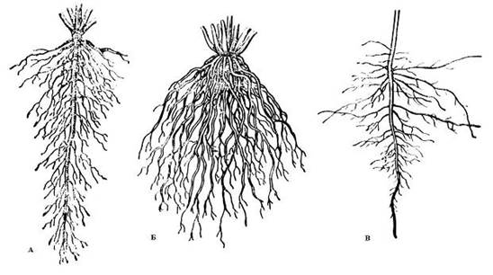 Рис. 4.1. Типы корневых систем : А – система главного корня; Б – система придаточных корней; В – смешанная корневая система (А и В – стержневые корневые системы; Б – мочковатая корневая система).