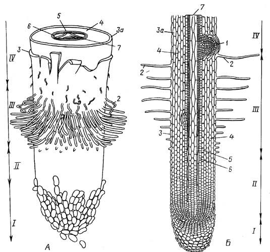 Рис. 4.2.Общий вид (А) и продольный срез (Б) корневого окончания (схема ): I – корневой чехлик; II – зоны деления и растяжения; III – зона всасывания; IV – начало зоны проведения: 1 – растущий боковой корень; 2 – корневые волоски; 3 – ризодерма; 3а – экзодерма; 4 – первичная кора; 5 – эндодерма; 6 – перицикл; 7 – осевой цилиндр.