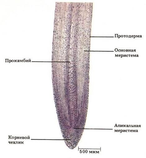 Кончик корня снаружи всегда прикрыт корневым чехликом, защищающим апикальную меристему. Чехлик состоит из живых клеток и постоянно обновляется: по мере того, как с его поверхности слущиваются старые клетки, на смену им, изнутри, апикальная меристема образует новые молодые клетки. Наружные клетки корневого чехлика отслаиваются еще будучи живыми, они продуцируют обильную слизь, которая облегчает продвижение корня среди твердых частиц почвы. В клетках центральной части чехлика содержится много крахмальных зерен. По-видимому, эти зерна служат статолитами, т. е. способны перемещаться в клетке при изменении положения кончика корня в пространстве, благодаря чему корень растет всегда в сторону действия силы тяжести (положительный геотропизм).