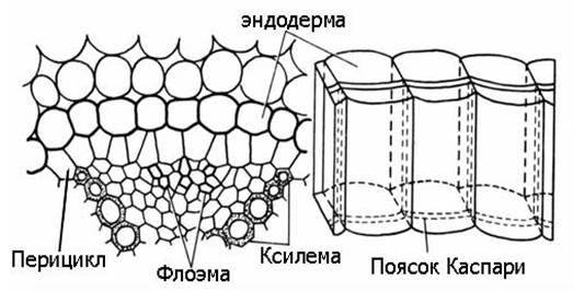 Самый внутренний слой первичной коры – эндодерма. Она в виде непрерывного цилиндра окружает стелу. Эндодерма в своем развитии может пройти три ступени. На первой ступени ее клетки плотно прилегают друг к другу и имеют тонкие первичные стенки. На их радиальных и поперечных стенках образуются утолщения в виде рамочек – пояски Каспари (рис. 4.5 ). Пояски соседних клеток тесно смыкаются между собой, так что вокруг стелы создается их непрерывная система. В поясках Каспари откладываются суберин и лигнин, что делает их непроницаемыми для растворов. Поэтому вещества из коры в стелу и из стелы в кору могут пройти только по симпласту, т. е. через живые протопласты клеток эндодермы и под их контролем.