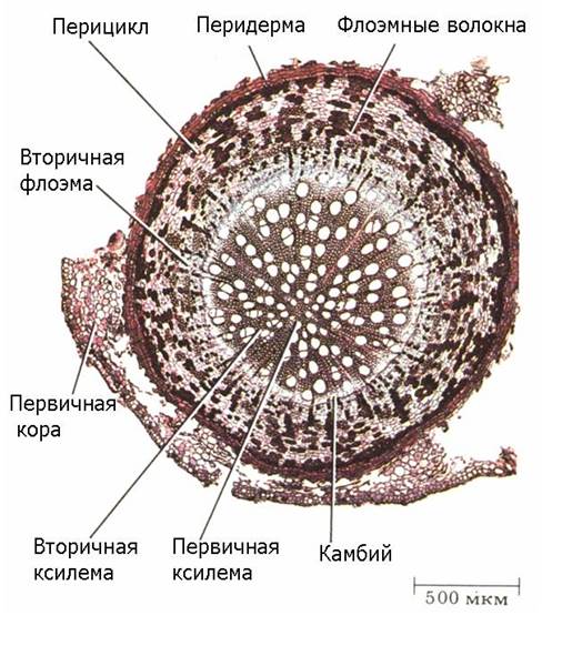 Вторичное строение корня. У голосеменных и двудольных растений первичное строение сохраняется недолго и выше зоны всасывания сменяется вторичным. Вторичное утолщение корня происходит за счет деятельности вторичных боковых меристем – камбия и феллогена.