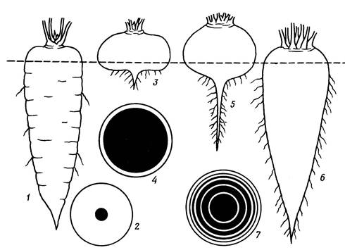 Рис.4.12. Корнеплоды моркови (1, 2), репы (3, 4) и свеклы (5, 6, 7) (на поперечных разрезах ксилема черная; горизонтальным пунктиром показана граница стебля и корня).