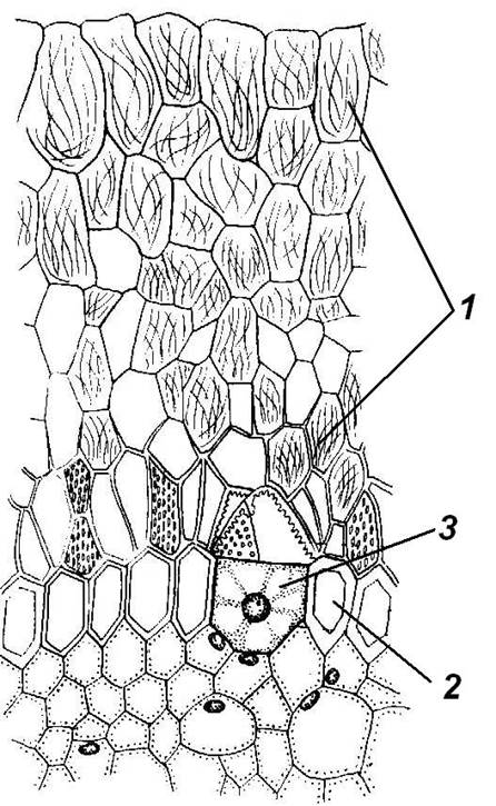 Рис. 4.14. Часть поперечного среза воздушного корня орхидеи : 1 – веламен; 2 – экзодерма; 3 – пропускная клетка.