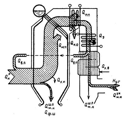 Расходная часть теплового балaнса в расчете на 1 кг топлива в общем случае может содержать теплоту, затраченную на выработку пара и различные потери: