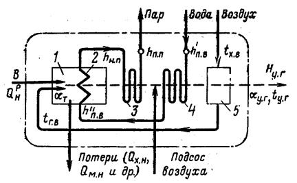 1 - топочная камера; 2 - испарительные поверхности нагрева; 3 - пароперегреватель; 4 - экономайзер; 5 - воздухоподогреватель .