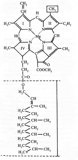 В центре молекулы хлорофилла расположен атом магния, который соединен с четырьмя атомами азота пиррольных группировок. В пиррольных группировках хлорофилла имеется система чередующихся двойных и простых связей. Это хромофорная группа хлорофилла, обусловливающая поглощение определенных лучей солнечного спектра и его окраску.