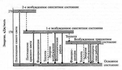 В первое возбужденное состояние электроны могут переходить, поглощая более мелкие кванты красного света. Время жизни на втором уровне составляет 10-12 с. Это время настолько мало, что на его протяжении энергия электронного возбуждения не может быть использована. Через этот короткий промежуток времени электрон возвращается в первое синглетное состояние (без изменения направления спина). Переход из второго синглетного состояния в первое сопровождается некоторой потерей энергии (100 кДж) в виде теплоты. Время жизни в первом синглетном состоянии немного больше (10-9 или 10-8 с). Наибольшим временем жизни (10-2 с) обладает триплетное состояние. Переход на триплетный уровень происходит с изменением спина электрона.