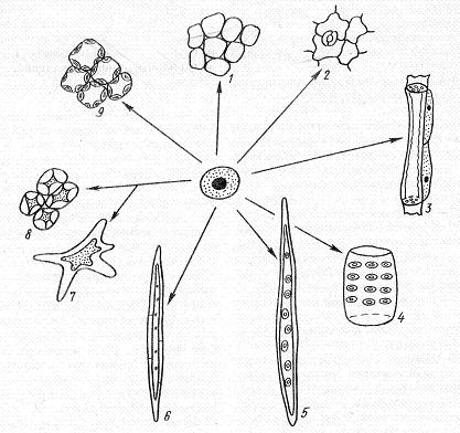 Рис. 5.9. Тотипотентность меристематической клетки. Производные клетки: 1 – паренхима, 2 – эпидерма, 3 – флоэма, 4 – членик сосуда ксилемы, 5 – трахеида ксилемы, 6 – склеренхимное волокно, 7 – идиобласт, 8 – колленхима, 9 – хлоренхима.