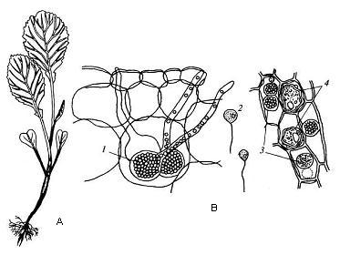 Рис 10. 1. А - «Черная ножка» капусты , внешний вид больного растения (возбудитель Olpidium brassicae), В - ольпидиум капустный в клетках корневой шейки капустной рассады: 1 – зооспорангии, 2 – зооспоры; 3 – голые протопласты , 4 – покоящиеся споры.