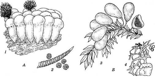 Рис. 10. 4. А – трихия(Trichia): 1 – внешний вид спороношения, 2 – часть капиллиция (особые нити в спороношениях, способствующие разбрасыванию спор) и споры; Б – леокарпус (Leocarpus): 1 – внешний вид спороношения, 2 – часть капиллиция и споры.