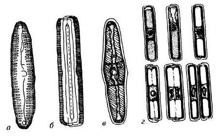Рис. 10. 7. Пиннулярия (Pinnularia): а - вид панциря со створки, б – вид панциря с пояска, в – вид водоросли со створки, г – последовательные стадии деления клетки.
