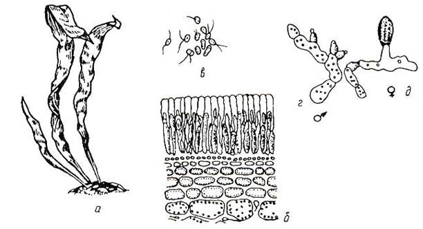 Рис. 10. 9. Ламинария (Laminaria): а – общий вид спорофита; б – разрез многоклеточного таллома с зооспорангиями; в – зооспоры; г – мужской гаметофит с антеридиями; д – женский гаметофит с оогонием.