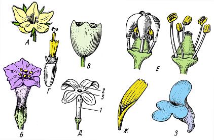 Рис. 13.6. Формы сростнолепестных венчиков . А – колесовидный (вербейник Lysimachia vulgaris); Б – воронковидный (табак Nicotiana tabacum); В – колокольчатый (некоторые однодольные); Г – трубчатый (подсолнечник Helianthus annuus); Д – трубчатый с блюдцевидным отгибом (сирень обыкновенная Syringa vulgaris); Е – колпачковый (виноград Vitis vinifera); язычковый (одуванчик лекарственный Taraxacum officinale); 3 – двугубый (большинство представителей губоцветных, многие норичниковые): 1 – трубка венчика, 2 – отгиб, 3 – зев венчика