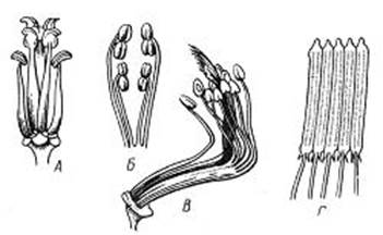 Рис. 13.7. Типы андроцея . А – четырехсильный (капустные, или крестоцветные Brassicaceae); Б – двусильный (яснотковые, или губоцветные Lamiaceae); В – двубратственный (бобовые Fabaceae); Г – со склеенными в трубку пыльниками (астровые, или сложноцветные Asteraceae)