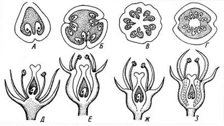 Рис. 13.9. Типы завязи . А – одногнездная завязь монокарпного гинецея; Б – вторично одногнездная завязь ценокарпного гинецея (паракарпный тип гинецея); В – пятигнездная завязь ценокарпного гинецея (синкарпный тип гинецея); Г – вторично одногнездная завязь ценокарпного гинецея (лизикарпный тип гинецея); Д – верхняя завязь, околоцветник подпестичный; Е – верхняя завязь, показан гипантий, к краям которого «прикреплены» тычинки, лепестки и чашелистики (околоцветник околопестичный); Ж – полунижняя завязь; З – нижняя завязь, околоцветник надпестичный.