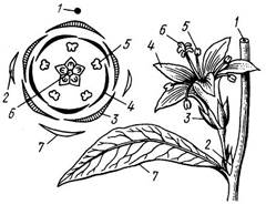 Рис. 13.12. Диаграмма цветка . 1 – ось побега, 2 – прицветник, 3 – чашелистик, 4 – лепесток, 5 – тычинка, 6 – карпеллы, 7 – лист.