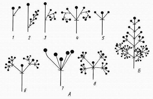 Рис. 13.18. Цимоидные соцветия . А – цимоиды: 1-3– монохазии: 1 –элементарный монохазий, 2– извилина, 3 – завиток, 4 – двойной завиток, 5-6– дихазии: 5 – дихазий, 6 – тройной дихазий, 7-8 – плейохазии: 7 – плейохазий, 8 – двойной плейохазий; Б – тирс.
