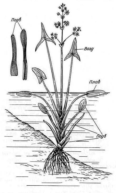 Рис. 15.3. Гетерофиллия у стрелолиста (Sagittaria sagittifolia): Подв - подводные; Плав – плавающие; Возд – воздушные листья.