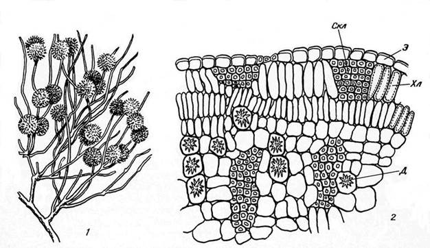 Рис. 15.8. Ветка джузгуна (Calligonum) (1) и часть ее поперечного среза (2): Д – друза; Скл – склеренхима; Хл – хлоренхима; Э – эпидерма.