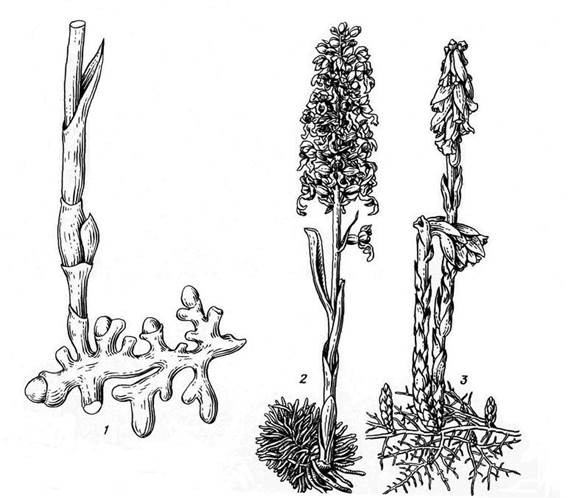 Рис. 15.9. Растения – микотрофы : 1 - корни ладьяна трехнадрезного (Corallorhiza trifida); 2 - гнездовка настоящая (Neottia nidus-avis); 3 - подъельник обыкновенный (Hypopitys monotropa).