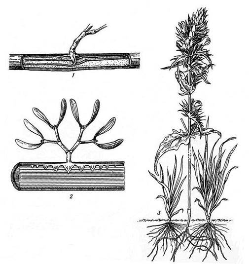 Рис. 15.10. Растения-полупаразиты : 1 – омела (Viscum album), нижняя часть растения; видны видоизмененные корни под корой растения-хозяина; 2 – продольный разрез ветви растения-хозяина; видны присоски на корнях омелы; 3 – марьянник полевой (Melampyrum arvense), паразитирующий на луговых злаках.