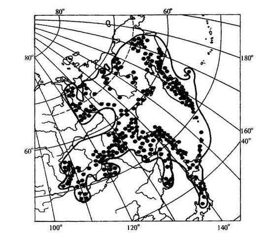 Рис. 15.15. Пример точечно-контурной карты ареала ( ареал кедрового стланика (Pinus pumila)).
